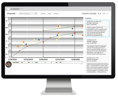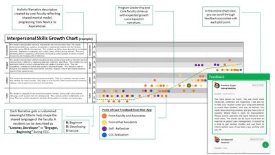 Residents (and their Program Director and CCC), can view their own detailed growth charts through the browser. The charts are rich with layers of information including all feedback given, self-assessment, filterable down to the evaluators, groups of evaluators, clinical environments and other pertinent context. They serve as a biographical timeline to professional identity formation. This timeline can traverse the continuum of learning from UME to GME to CME if institutions so choose. The chart narratives are customizable, personal and map to the AAMC and ACMGE milestones, which can also be charted.